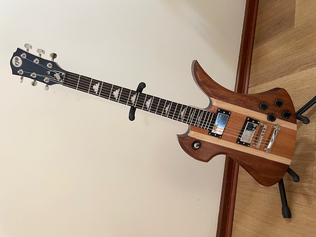 Mahogany Body with pine inlays. The wings are stained with Feast Watson Old Baltic. Finished with 2 brushed on coats of wipe-on poly, then sprayed on coats of Cabot's water-based gloss polyurethane. The headstock is painted with MTN 94 black, and final coats of Cabot's poly. The logo is a pearloid disk with a Cricut vinyl sticker. Truss rod cover is made from 3-ply pickguard material with Cricut vinyl sticker of the MB.