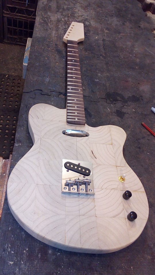 Popeye got the blank for his end grain axe sanded fairly flat and cut this modified tele shape with bit of an offset. Yesterday arvo I did the routing of the cavities for him and did a mock build with a mix of hardware