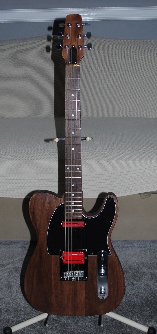 I've been laid up for a while, (not C19 thankfully, but a foot problem) so no building etc. Been sitting at home playing and practising scales etc. As a way back to this obsessive pastime, I decided to finish the shortscale in walnut wax, after some success with the tenor and wax. The wood is a bit uneven in shade and I may apply another coat in the future to darken and level the shades. The wiring fell together without problems and the only hiccup was the bridge humbucker was very low volume. After cursing the maker, supplier and myself, I realised that it was at its lowest possible position about half an inch away from the strings! Homer Simpson moment Doh! Pulling it up many turns on the set screws revealed a real screamer. Of all my builds, this Tele has always been the nicest to play when it was initially put together and rested, virtually no set up issues were encountered. I took the brass nut down a few thou and it is even better. So, happy with this one!