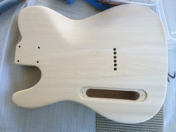 Over the last couple of days I’ve put a belly cut in the back and sanded down to 400 grit and grain-filled with Walnut TimberMate. I want to enhance what grain there is in the Basswood body and thought that a dark fill like Walnut would give it a bit of a boost.