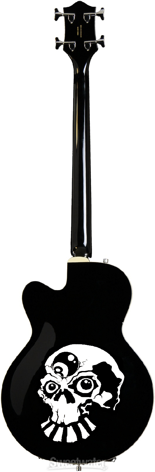 My idea is to emulate the look of a Gretsch G5440 Long Scale. I am definitely tempted by the glossy black look with chrome trimmings and I want to put one of my custom illustration at the back (based on an old pearl jam sticker). Like this.