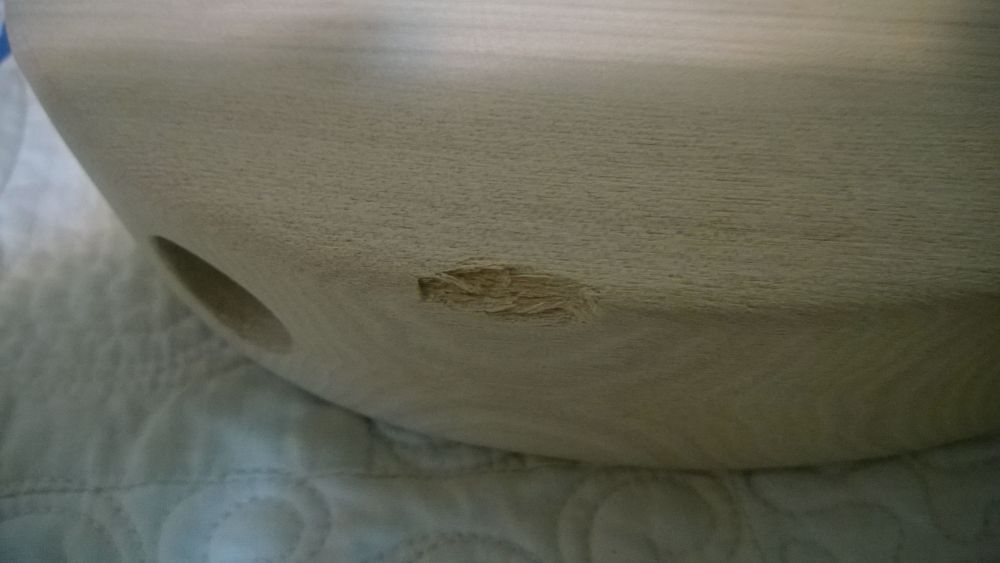 Overall the damage is fairly minor - looks like a chip out of the bottom bout.
