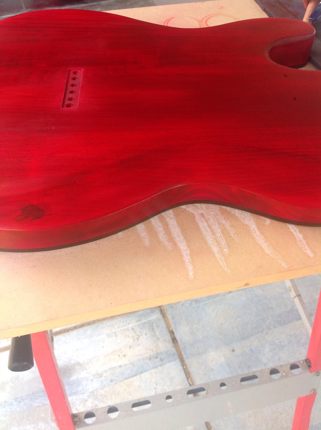 Hey Geoff, how are you and welcome to the site. Easiest way to stain is use a product called Angelus Leather Dye. It applies easily and they have a massive amount of colours I've used the red yellow and orange. And you can mix the colours easily. I know Angelus is available in UK as my buddy Jamie uses it. Just make sure you get the leather dye. The red and yellow is amazing.Then when you are ready you can use either acrylic spray in either gloss or satin. If your not into spraying use Crimson Guitars guitar finish supposed to be a clone of true oil in bigger bottle cheaper. Supposedly had two chemists to work on the formula and improved on it. There's enoughin one bottle to do one guitar gloss or two guitars satin. Make sure you wear gloves using the Angelus not because it's incredibly toxic. It just loves to attach to your skin and likes to stay there. The beauty of the Angelus dyes is they blend beautifully. Have fun enjoy your guitar.