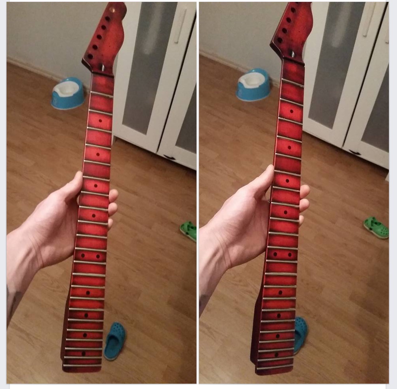 hope you have sufficiently sanded the body and neck prior to staining ?