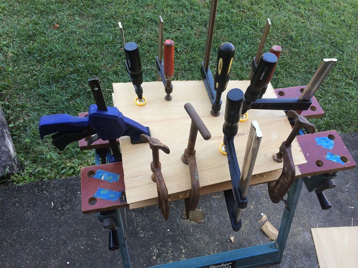 I just laid a couple of pieces of thin ply over the body so as not to leave clamp marks on the soft pine. Unlike my first pine guitar I have put some locating pins in the 3 pieces to stop them from “squirming” around under clamping pressure while gluing.