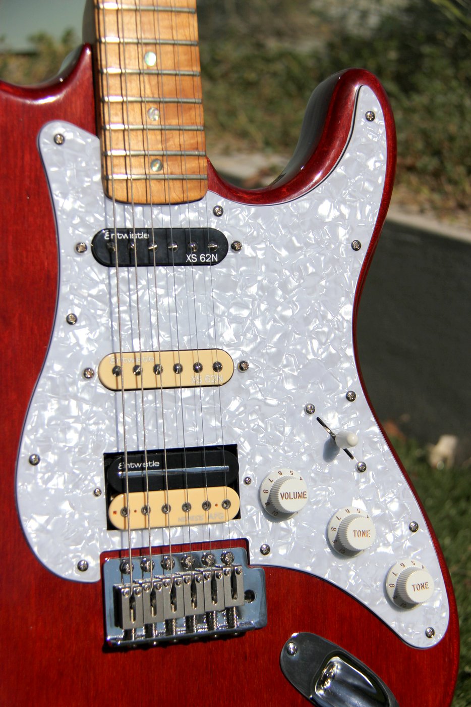 For the electronics, I got from Adam a pearloid white scratchplate, and Entwistle pickups: 2 x XS62N for neck and middle, and 1x Entwistle Nemesis AFG Bridge humbucker. I wanted very hot pickups to make up for the plywood lack of tone. This was going to be rock guitar, not blues!