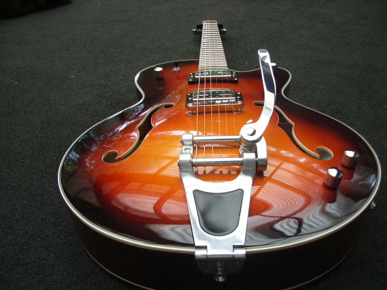 Headstock has a burl veneer, not sure what species just liked the look, and I slightly reshaped to match the Falcon a bit closer. Mother of pearl truss rod cover, I shaped to compliment finger board inlay. Finish is in Nitro. Colour is with Starcast amber and Encore brown. The redish hue is from extra shading with the amber. 8 or so light coats of gloss clear and lots of elbow grease. All the hardware is stock from PBG. Thanks JB