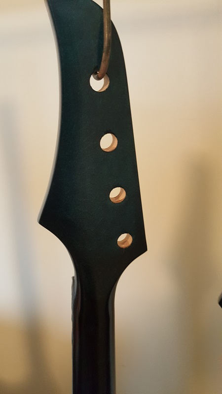 Oh...notice the difference in colouring across woods.....the body and the neck of the 6 string are taking stain and poly with similar results...a blue to green colour.