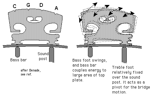 I've read a bit about the pros and cons of different bridge designs which are typically used on classical instruments (violins, cellos, double bass etc). It seems most of the considerations were to do with the way in which strings cause the sound board to vibrate.