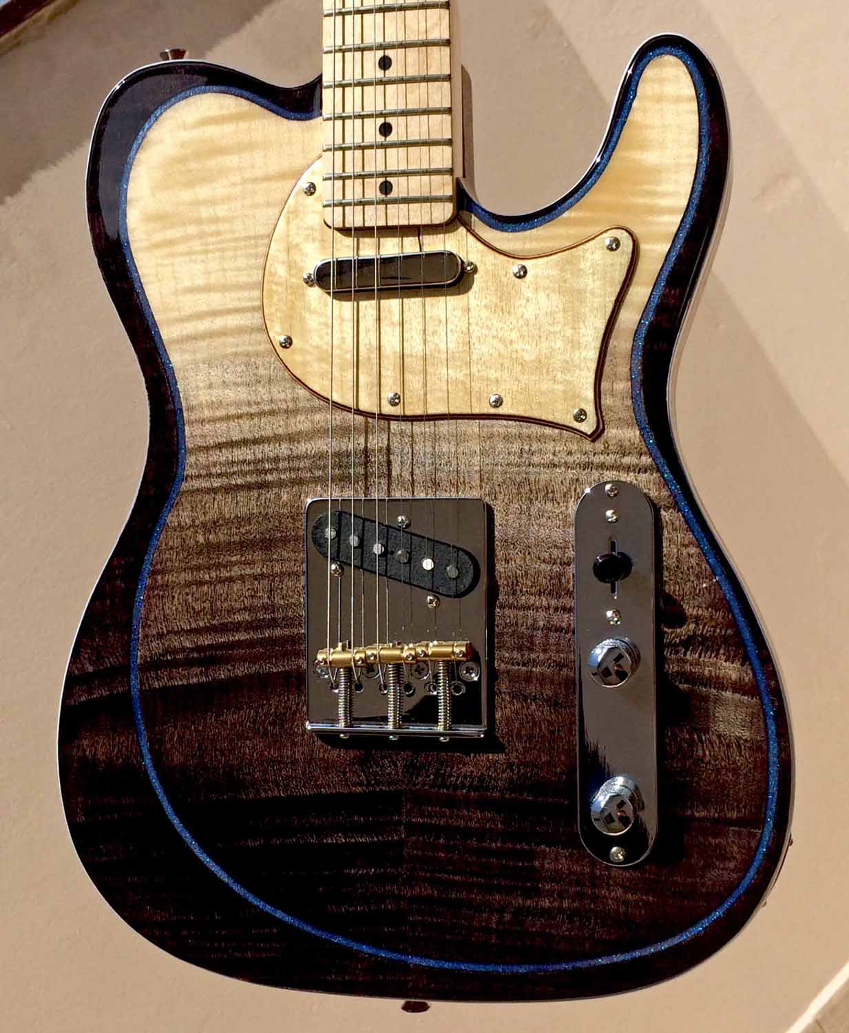 Really deep and clear finish. My wife chooses those color match (faded black + deep blue purfle). The pickguard was made by hand using 4 layers of 2 species of Australian wood (don't remember wich was).