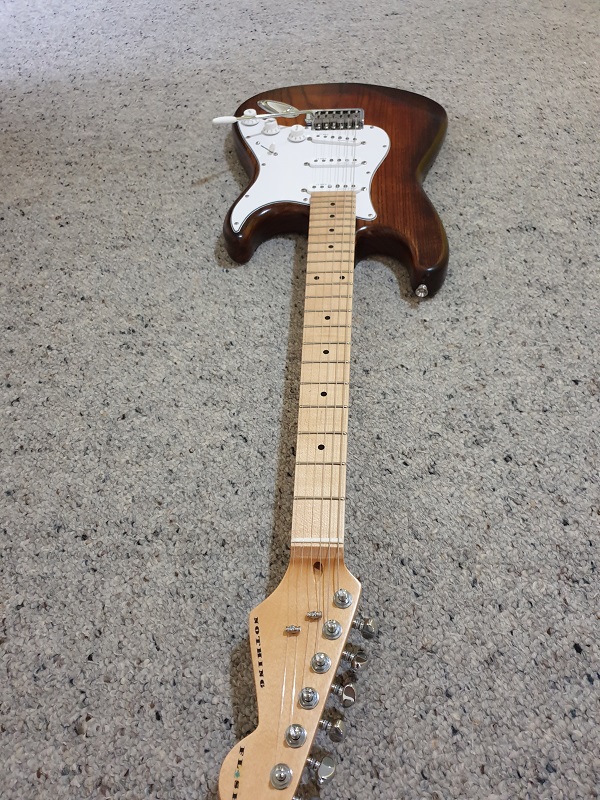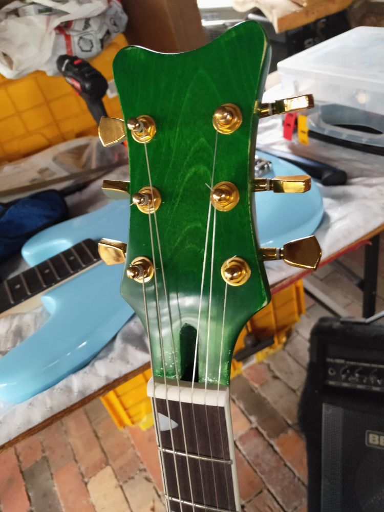 Here is my finished GR1SF. I used black dye then sanded back to make the grain pop lots more fine sanding, then several coats of green dye followed by several coats of spray on poly, sanding between coats a final sand with 2000 paper cut back and polish. Numerous hours on the frets and a set of slinky strings made this play like a dream.