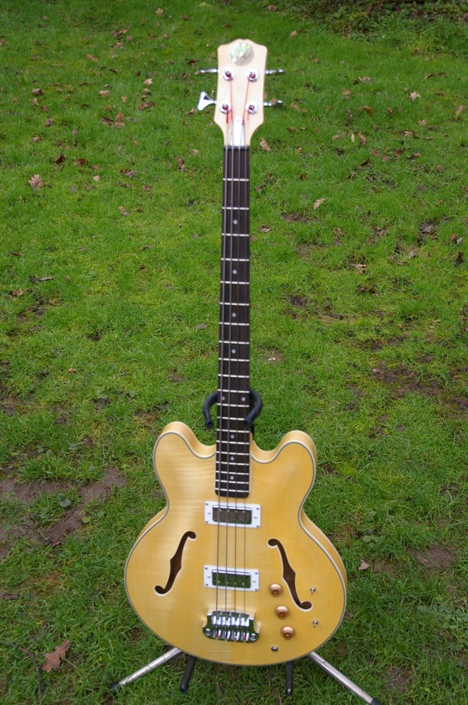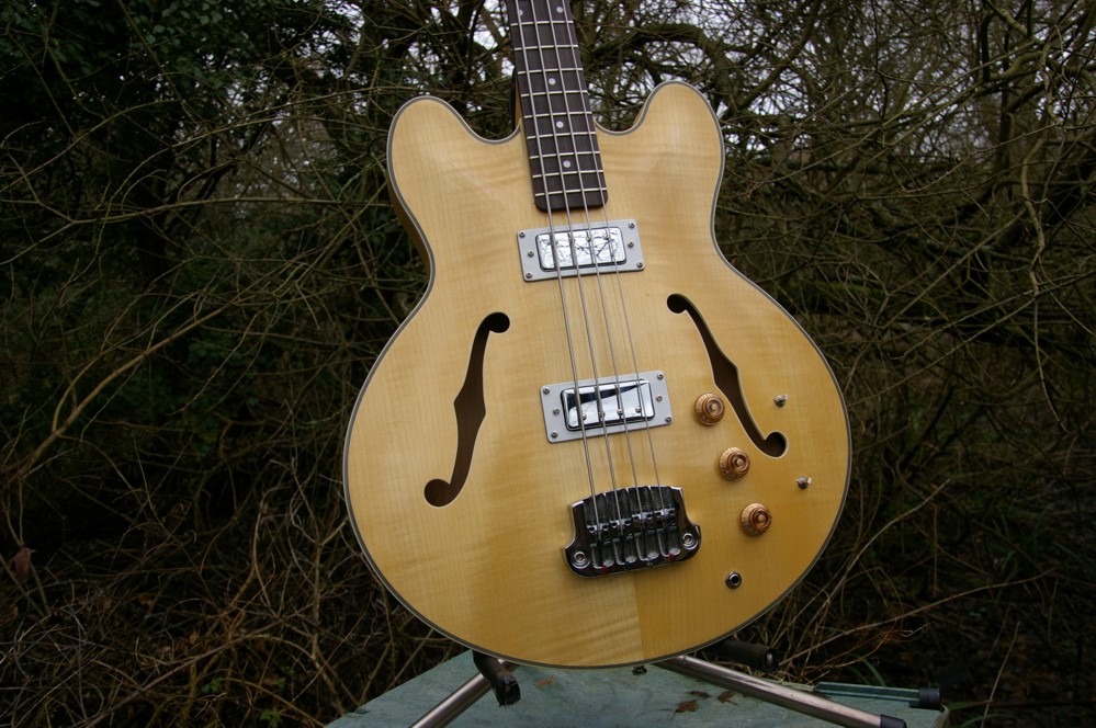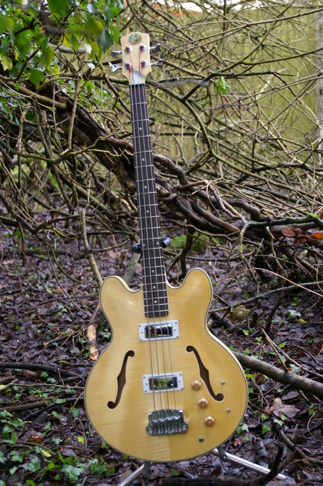 The finish is natural, in Tru oil, with the exception of the engineered rosewood fingerboard which has been treated with a low viscosity epoxy primer and then lemon oil. It seemed to me that it only had very moderate flame in the top, so a spectacular finish wouldn't work well (and besides, that's not me). Oddly the flame in the maple is more visible in the photos than it is to my eyes.