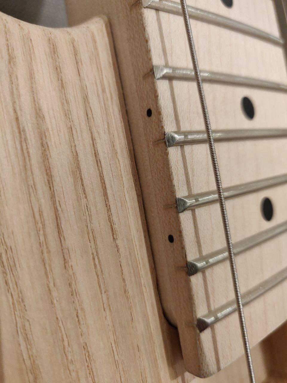 The way I see it, the only way to find out the answer to that is to put the whole thing together pretty much completely. I don't need the new tuners for that, because while I will be fitting the E strings to check everything lines up (and to see whether that short fourth fret is an issue), the line that they follow will be determined by the nut and the bridge saddles.