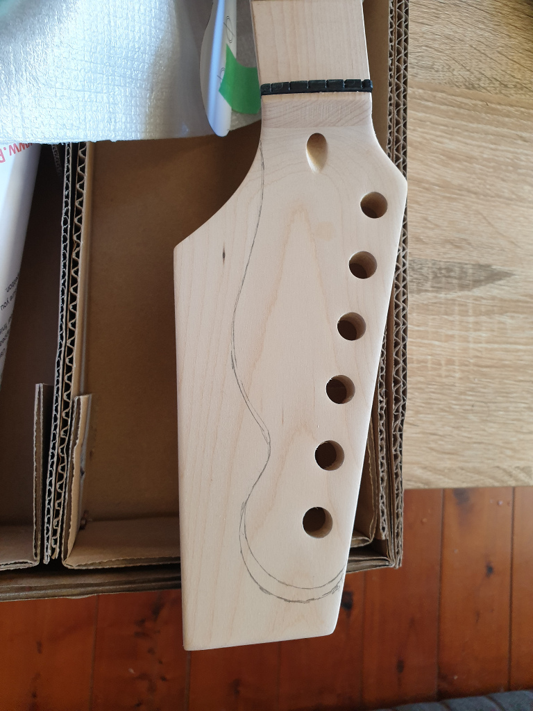 Been a bit busy building a fence so this has just been sitting in the box for a few weeks, but now it's time to make a start. First stop, cutting out the headstock. Wasn't happy with the first draft so drew a second one with a bit of extra real estate. Glad I didn't just jump in there and hack away.