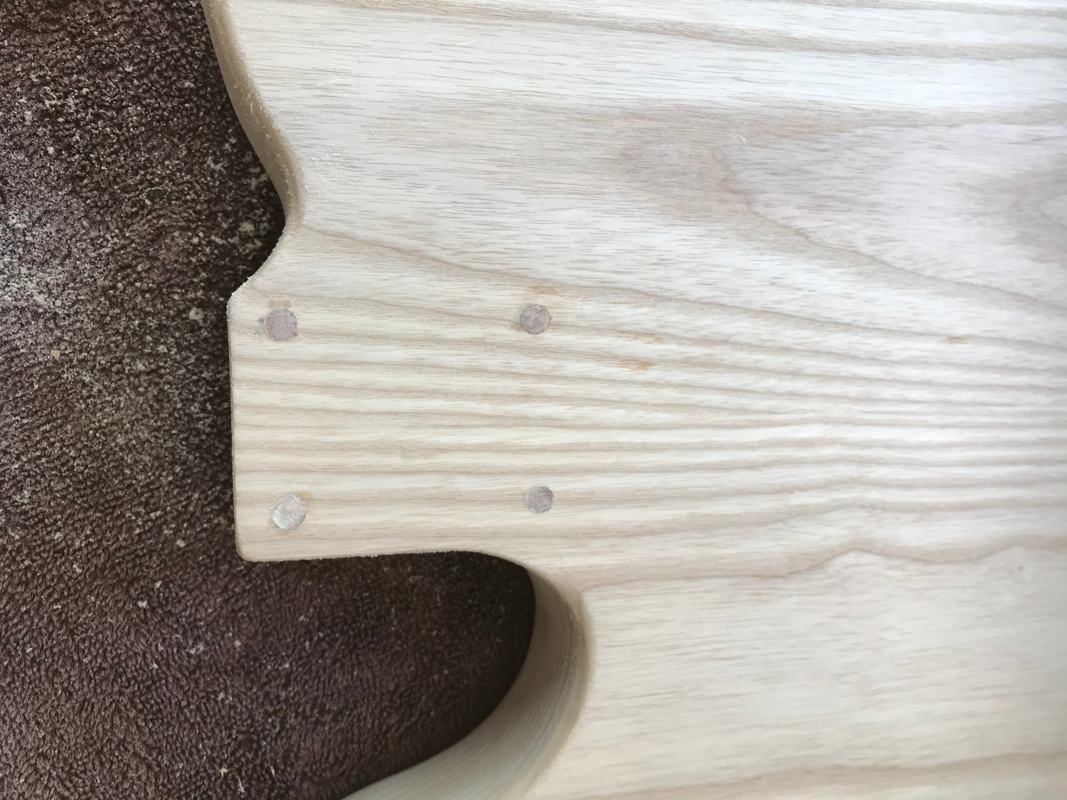In the meantime, I've plugged the neck holes. There was just one that was quite out of alignment, so I was just going to plug that, but then I found that none of them were drilled perpendicular to the body, so I plugged all of them.