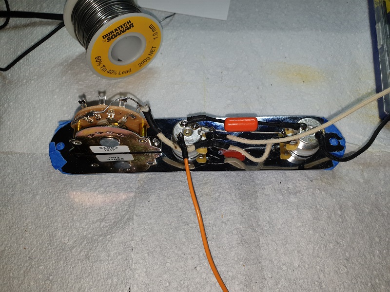2 x 500K mini CTS pots, 1 x 0.0223uf orange drop cap, oak Grigsby three position switch, switchcraft jack socket, recessed electro socket chrome jack socket hardware, chrome control cover with USA thread holes, chrome strap locks.