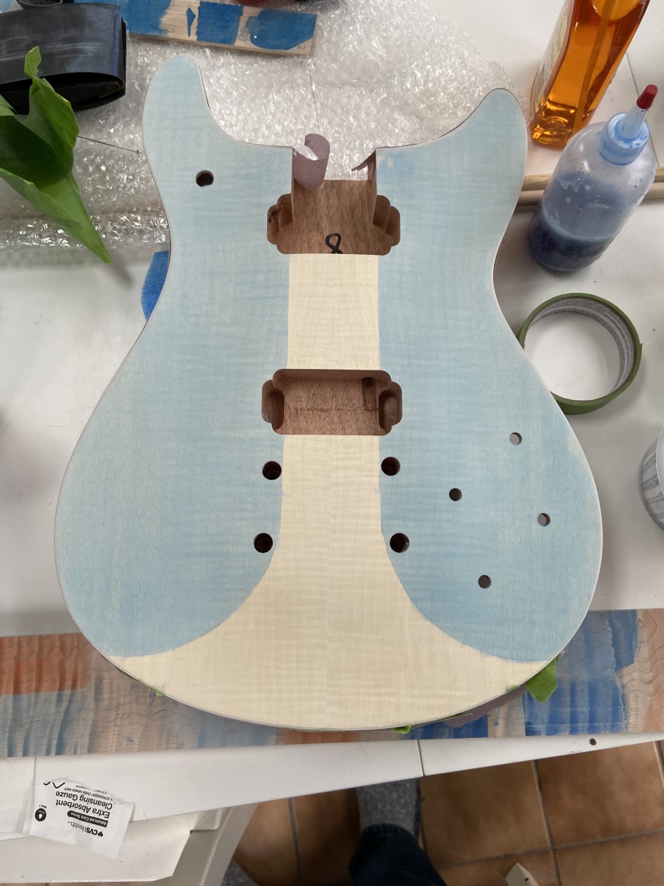 After many tests, I'm about back to where I started, with a simple pair of highly-diluted water stains (TransTint) and high quality tape. The whitewashes I've tried so far -- including store bought versions, tinted homemade mixes and even pigmented wood-grain fillers -- obscure too much grain detail for my taste, and while I know many do some light sanding on these PB laminate tops, I am reluctant to remove any material. The basswood back is less of a concern for me; it'll be something darker than the top, but I'm not terribly worried about it. I did the pattern tonight, and I'll likely start the coloring tomorrow. Fortune favors the bold.