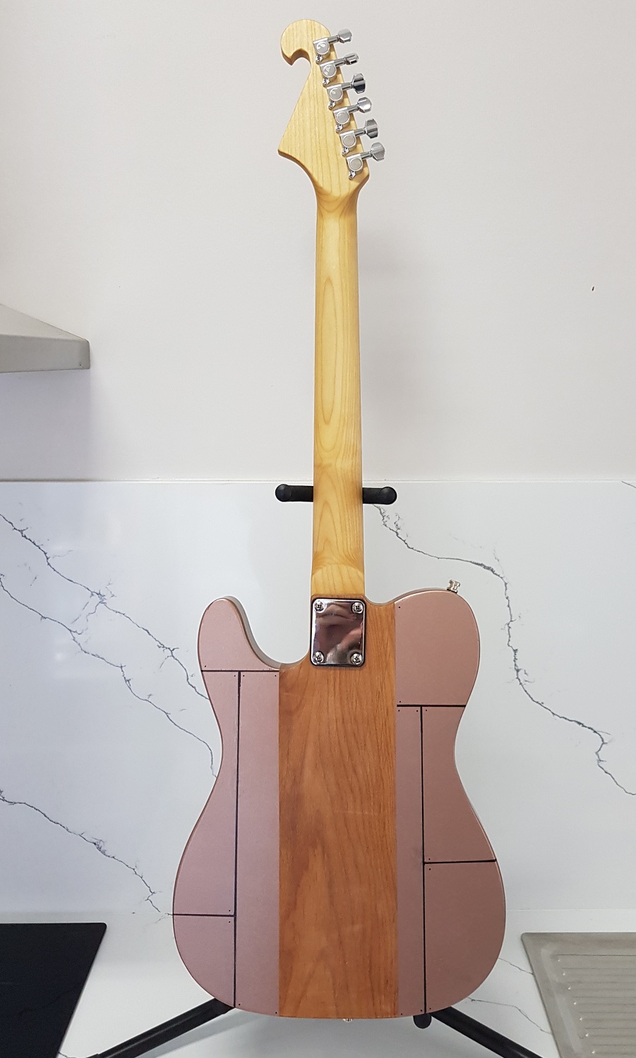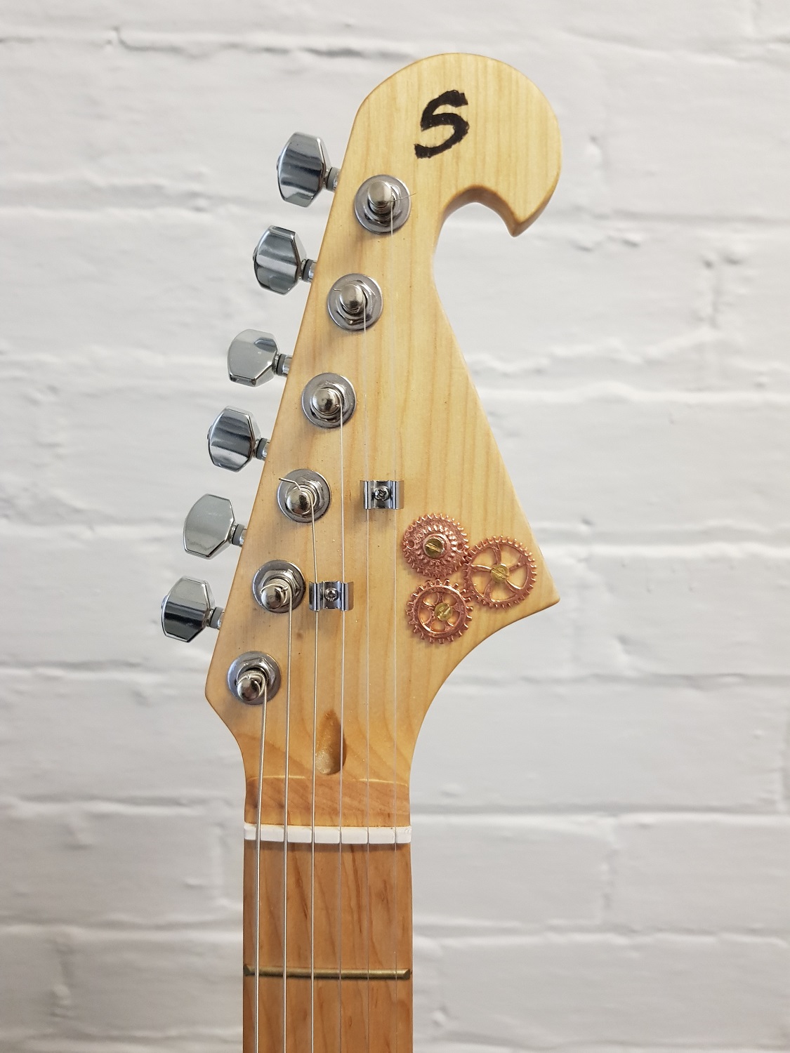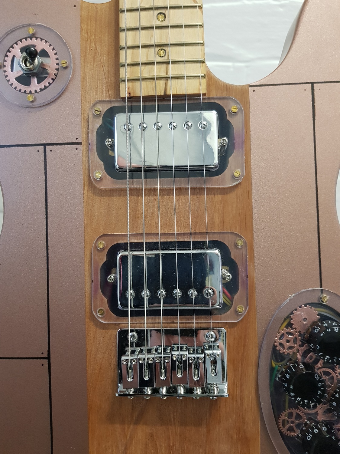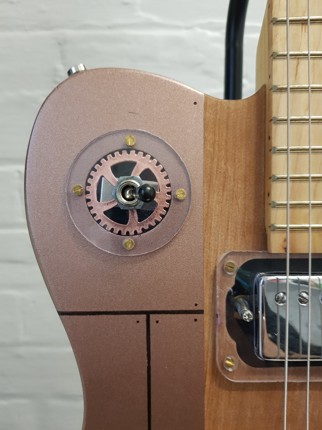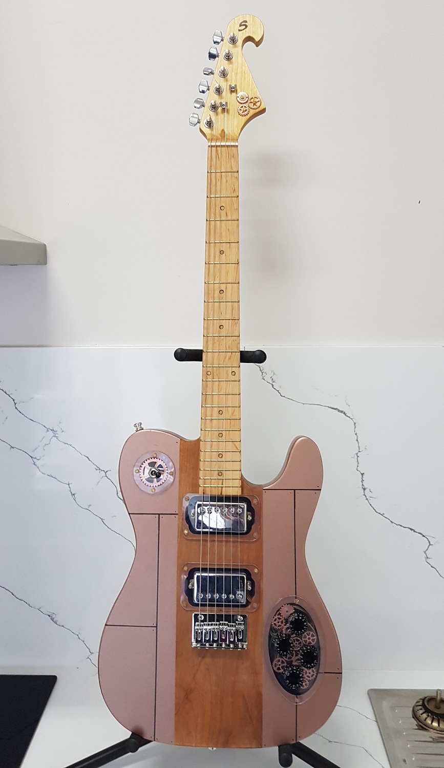 Hey Fellow Guitar builders! Here is one that has been at least 12 months in the making. I bought it from Pitbull just as the Covid-19 lockdowns started. Due to restrictions and other issues didn't get round to finishing it until just recently. I like the design but wasn't really enamored with the scratch plate, which threw me into a new direction design wise. I originally had the selector switch cover and tone/volume pot covers cut out from some alloy checker plate....but changed my mind when I got some of the copper cogs for a different project. Well the end product speaks for itself I reckon. As far as the hardware on it, it is all stock standard kit hardware. The only changes were changing the Strap buttons to Strap lock ones and changing most of the mounting screws to brass flathead screws to keep the theme going which I actually used in the fret dots after drilling them out. Which I had to shorten the screws because of the lack of depth they could go. The metallic copper spray was applied to two thirds of the guitar and then I airbrushed the line work on it to give the appearance of Copper plating. The rest of the body and neck had copious amounts of Tung oil applied for protection.![]()