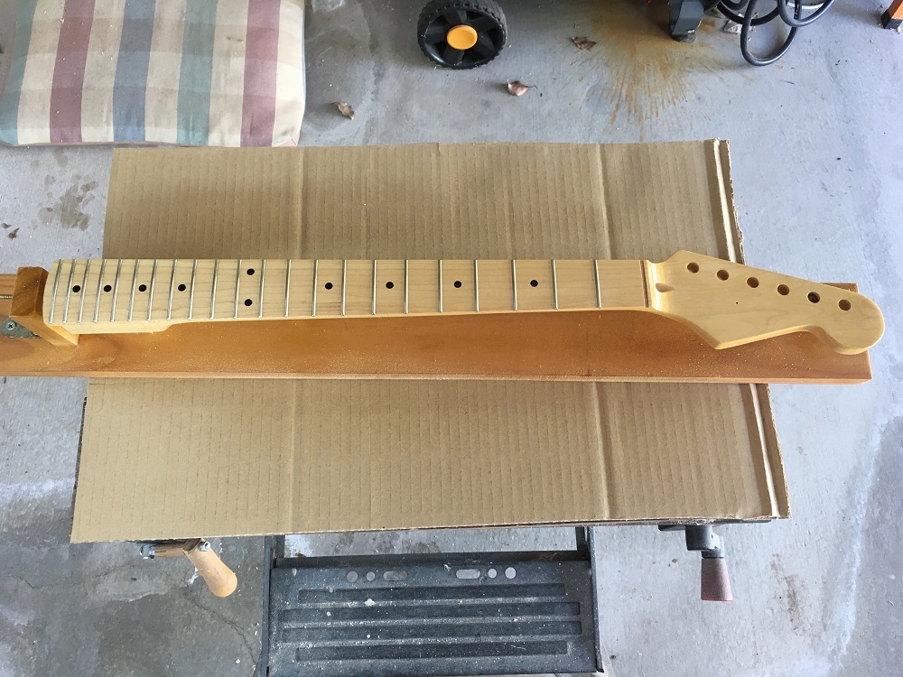 The neck is currently finished in acrylic lacquer, which I've decided I dislike, so I'll be scraping it back and refinishing with satin poly. Of course that's after I install new frets. Got a stack of fretwire already so will hopefully get to it this week.