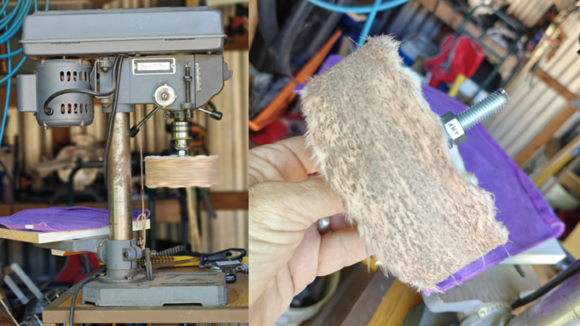 I have finally gotten around to experimenting with using a drill press to buff a guitar body. I got some 6 inch buffing wheels from Temu, which I mounted on a large bolt, which I shortend with an angle grinder so that the buffing wheel would be about half way between the gear box and the base on my very short drill press.