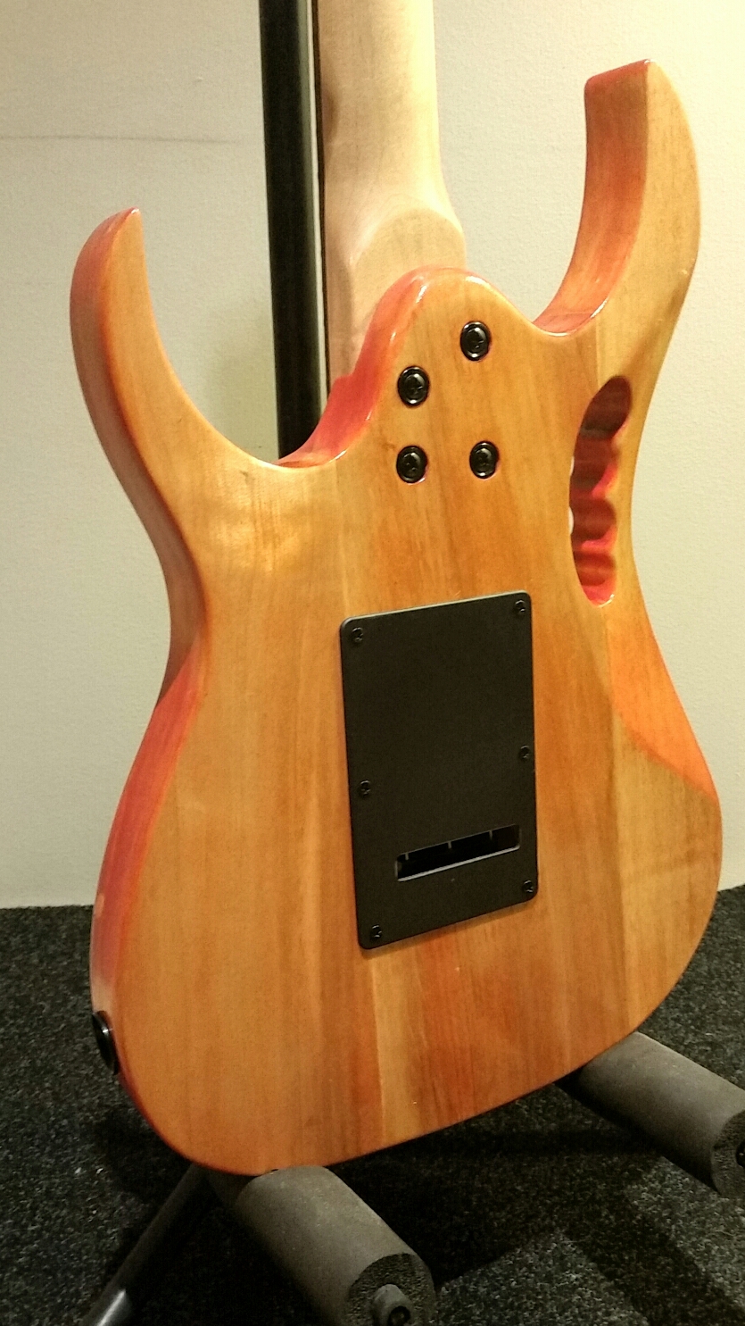 So this is what I ended up with. As I said the kit is the left hand version of the PB SV-1. I ordered the Grover locking tuners with it (luckily, as I was going to use the kit ones but one of the plastic pegs deformed and just rotates on the shaft so I had to swap them out anyway). Changes include eBay humbuckers with pink bobbins, a pink cover for the single coil, knockoff tune/volume knobs, mushroom strap buttons (same as I use on my other guitars), Ibanez sticker (I know, I know.....), repainted the pearl pickguard (wish I'd known the pearl was a sticker BEFORE I was half way through the colour layers) and a 5 minute truss rod cover. I've got a string bar but it doesn't need it and will just get in the way. The pink is White Knight Fluro Pink (it was the closest to the Ibanez colour I could find easily) from Bunnings. After grain filler and primer I just kept putting thin coats on until the 3 cans were empty (over the space of a month) and then another 2 cans of clear. This paint is absolutely rubbish and even after a month when I was wet sanding the clear flat I realised it still hadn't cured, so left it another month. The neck is done with about 12 coats of Tru-Oil.