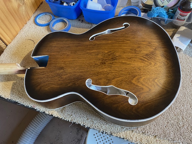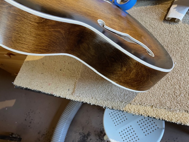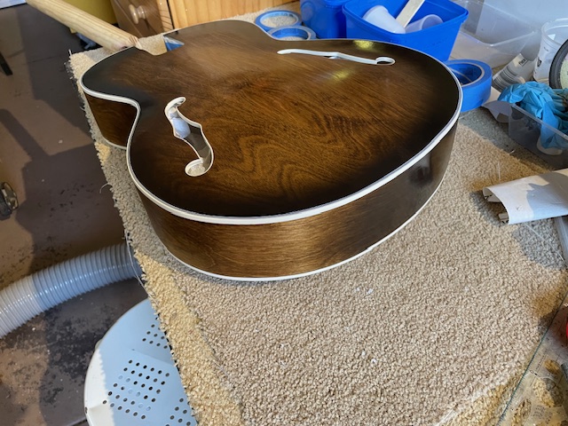 I am impressed by your scraping method. I confess that I have been cheating on my archtop builds. I did solid colors on the tops, and painted over the vertical surface of the binding. I only scraped of the horizontal part of the F-hole, and even then only where the 3M tape did not catch everything.