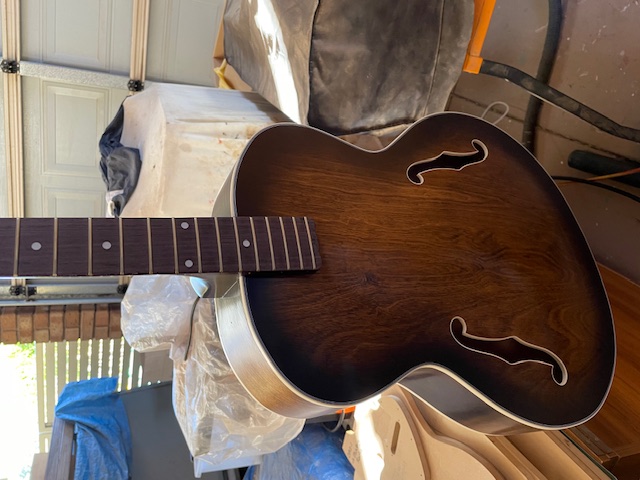 0One lesson I did learn today - after getting dust falling onto the wet finish - is that the cavity needs to free of dust and binding shavings, otherwise the air pressure from the spray gun going into one f-hole will blow rubbish out the other f-hole! Live and learn.