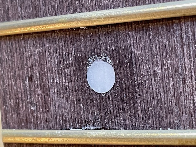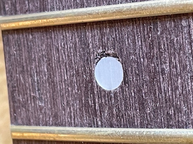 The fretboard did have a couple of chunks taken out near the 3rd and 9th fret inlay dots. I ended up adding a few drops of CA glue to the hole and then scraped the area flat using a razor blade as a scraper.