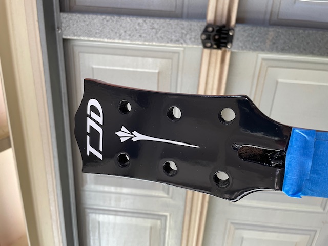 Added my logo using a vinyl sticker cut with a Cricut machine. Then gave the headstock another coat of poly (this may be the last spraying opportunity until next springas the temperature here is dropping to low 20's (and high humidity)).