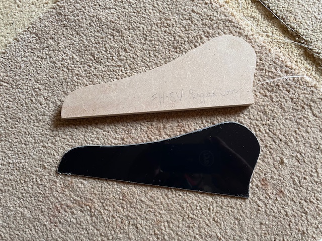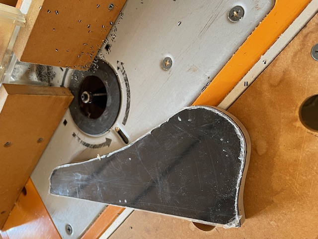 Also created a 3-ply pickguard. I made an MDF template and then used the router table with a pattern following bit to cut the pickguard. Also added a 30 degree camber to the edge.