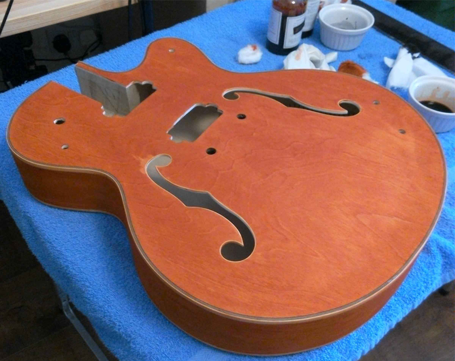Next after years of sanding was two coats of orange stain for the body.Click image for larger version.