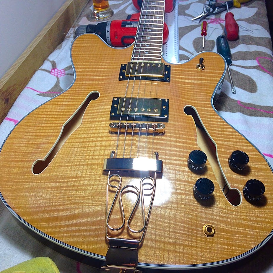 Wiring is complete, the mass of wiring associated with splitting the humbuckers was impossible to hide from the f-holes, so I reverted to a bog-standard installation.