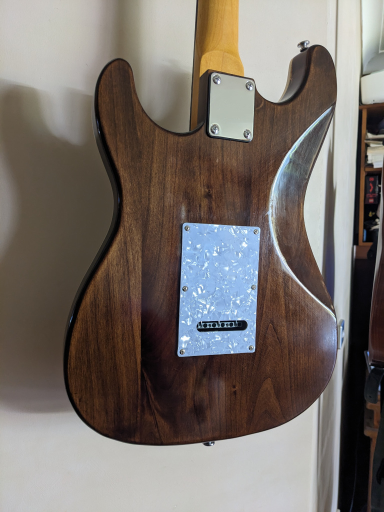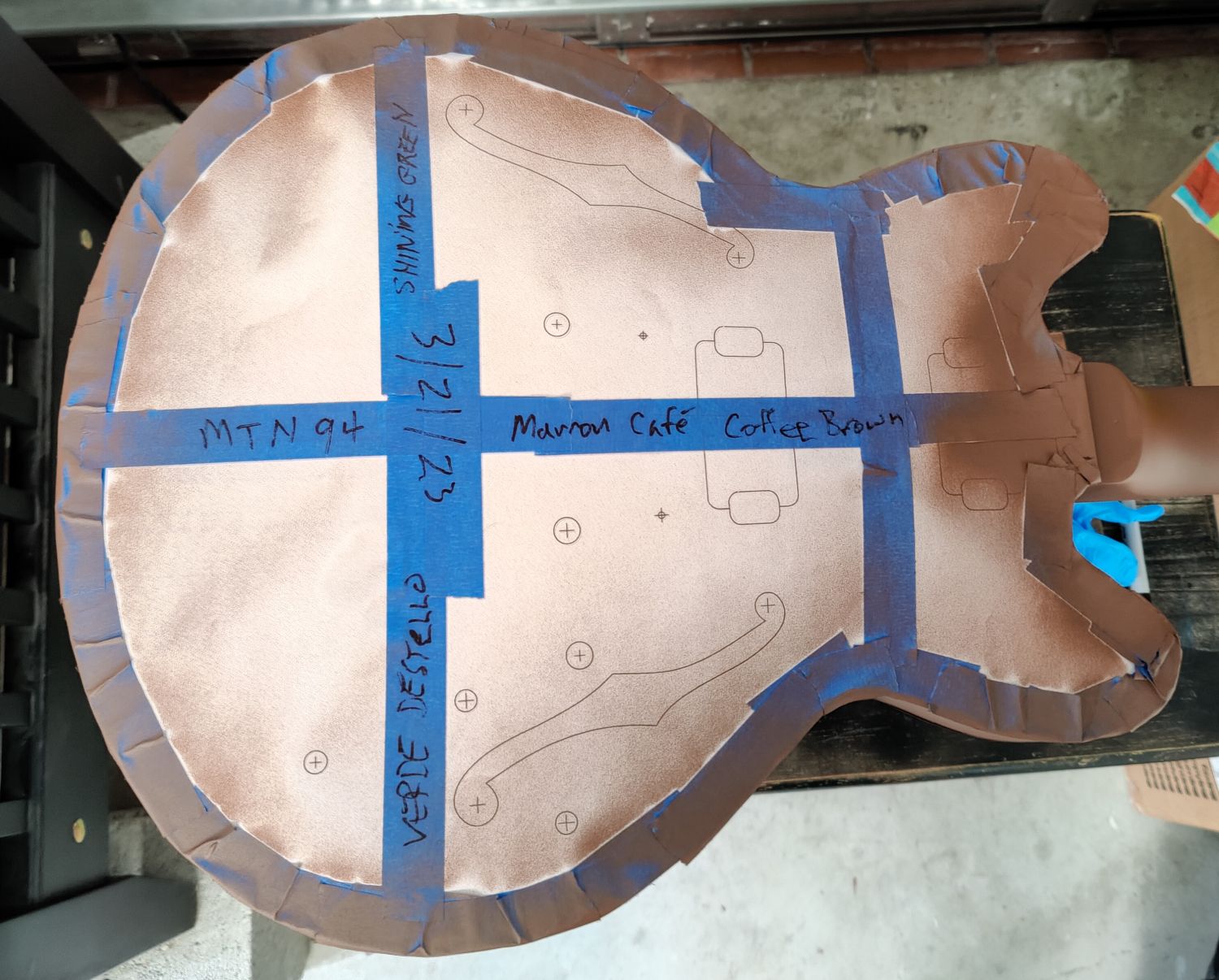 FWIW You may not want to leave the masking tape on the guitar too long. I try not to leave regular masking tape on wood or paint. It's generally OK for short periods, but the adhesive is stronger than blue or green painter's tape and can pull paint off, or even veneer off, if you are not careful. Also the adhesive can leave a residue, particularly if your climate is hot, humid or you leave it on for too long. I actually don't like to leave any sort of tape on for very long... Here's the way I did my last one. I had already painted the top and was doing the sides at this stage.
