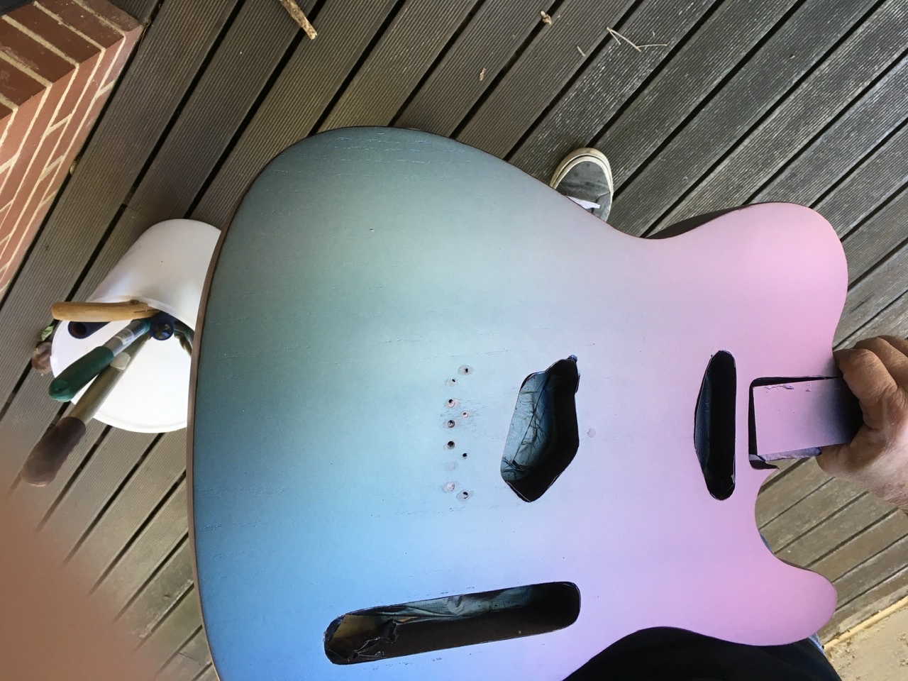 Oh man, just when things were going well .... that's usualy the way. Until you have that clear on and cured you have to be so so careful, because base coat is fragile. Once the clear is on the colour shift effect and pearl/metallic will realy pop. Pics of bare base never do the finished effect justice. It's gunna look killer when it's done!