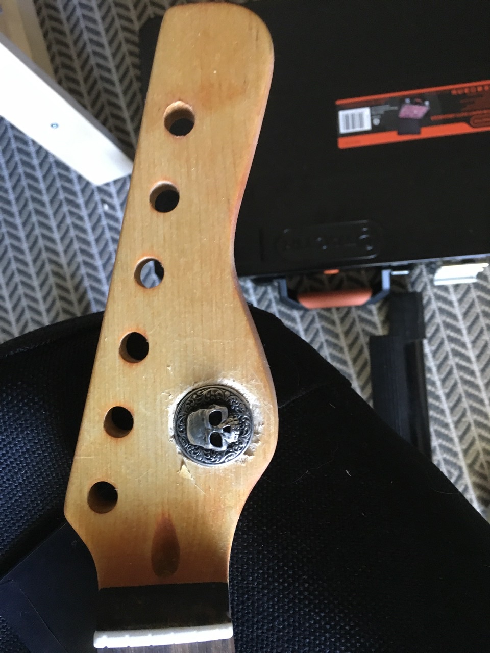 Except for the tiny detail that, it dropped onto the floor (and some pedals stored on the floor, conveniently directly under the drying guitar).