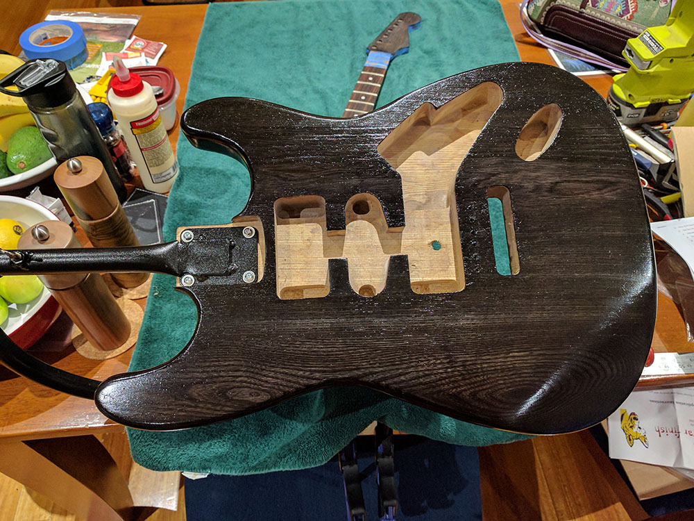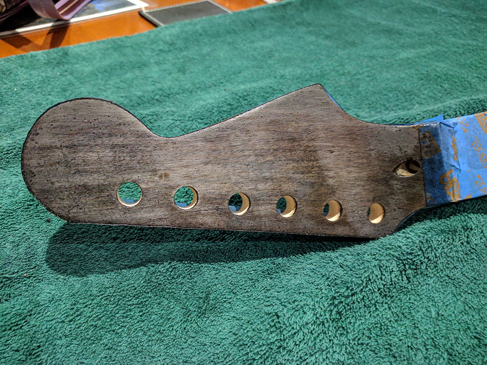 I'm not too fussed about getting the headstock a deep black, just dark enough to provide some contrast to the gold hardware, still have the intensifier to go so it should get a bit darker. Definitely prefer to have grain showing and it a bit "faded" than to spray it.