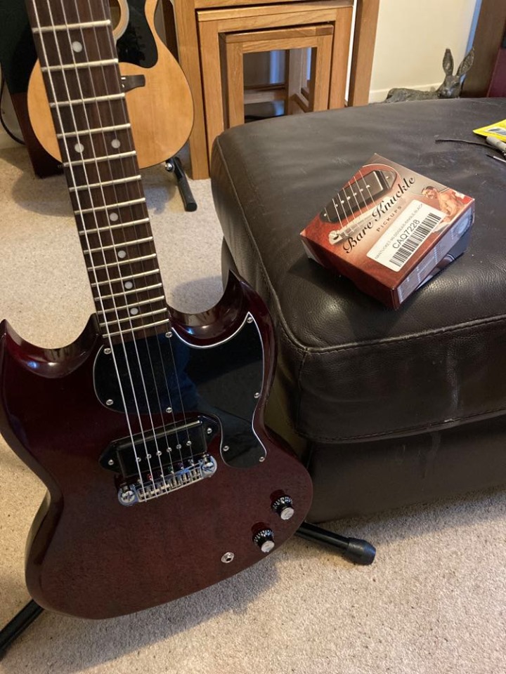 Bare Knuckle Nantucket 90 arriving today for it. If that sounds bad then I'll not know what to do. But I can't fit it until my piece of fibreboard turns up so I can make a spacer for the pickup, as it will still need one to raise it up a bit. £8 for some 3mm thick fibreboard I can easily cut out myself, or £15+postage for some ready-made spacers. An easy choice.