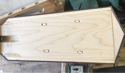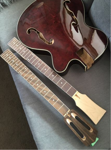 Back in business. The neck has arrived, nice and straight out of the box. On my previous two set necks I’ve found the neck angle to be too shallow for a floating bridge resulting in me having to modify bridges to fit. The angle of this neck appears to be better, but something I’ll have to get spot on this time if I’m to use the roller bridge. I’m also changing the headstock to a simpler shape which I think will look better and be more in keeping with the guitars overall mojo.