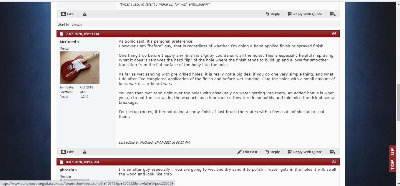 I have a strat body on the bench now that I plugged yesterday for wet sanding today.