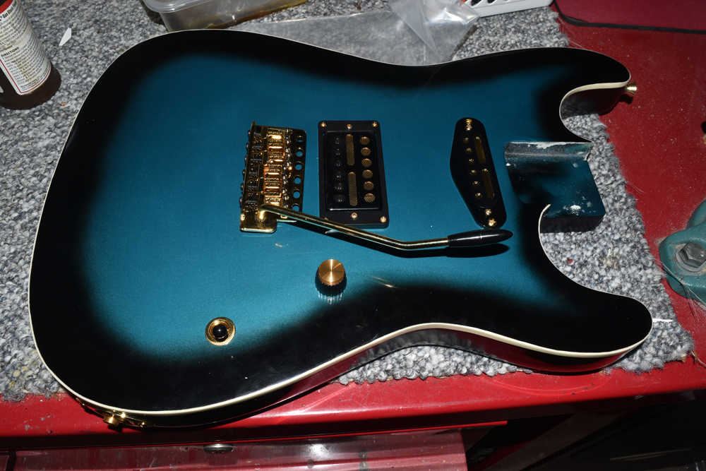 wired yesterday, attached neck and bridge today. Sounds a bit nondescript really, but then I've been playing the DM1 with the hot Armstrong in it a fair bit. There are a few flaws in it (thats not a paint flaw on the top horn its a big greasy thumb print LOL) but it's done and it plays nicely. Will replace the strings and do intonation next weekend. I'm liking how it looks a bit like an old ESP or Teisco