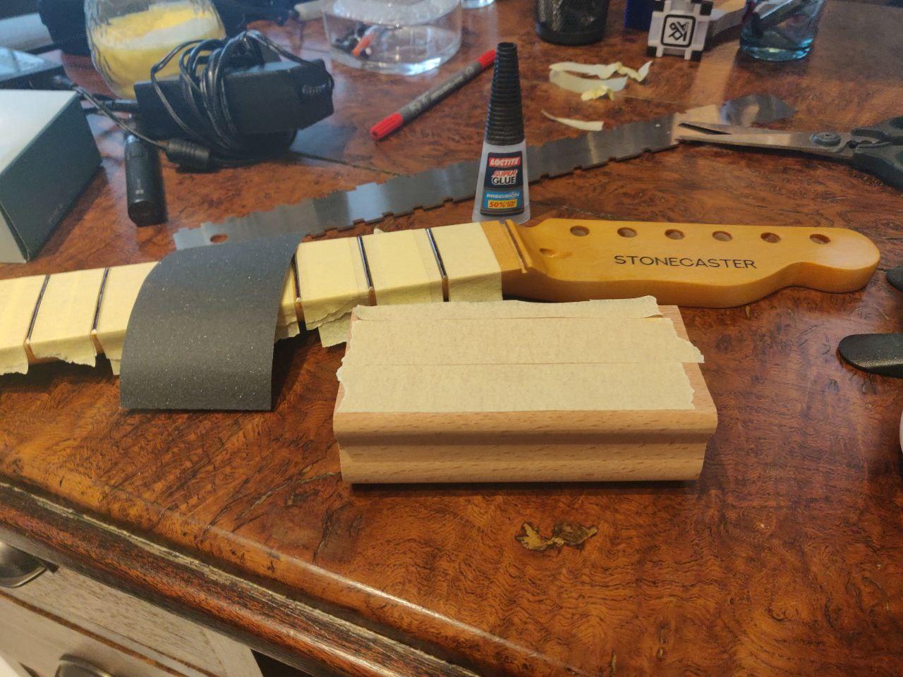 Masking tape also on the inside of the 12" radiused sanding block, superglue on the tape...