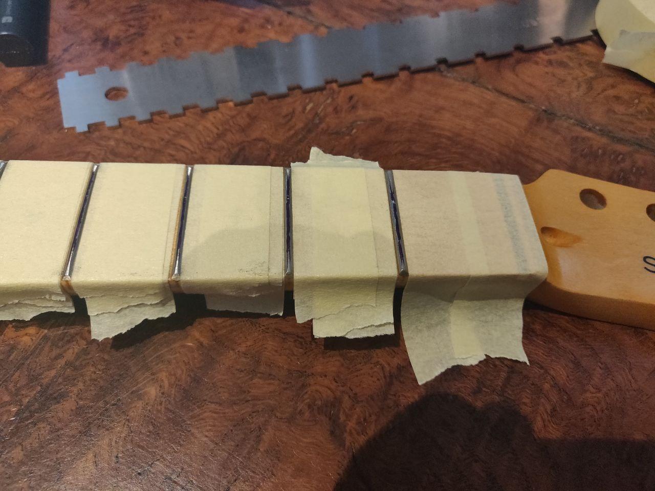 Time for some fretwork. First thing was to make sure that the neck was straight using the notched straight edge -- it was a tiny bit concave, so fixed that. Next I masked the fretboard with tape; this took way longer than I expected and was very dull: