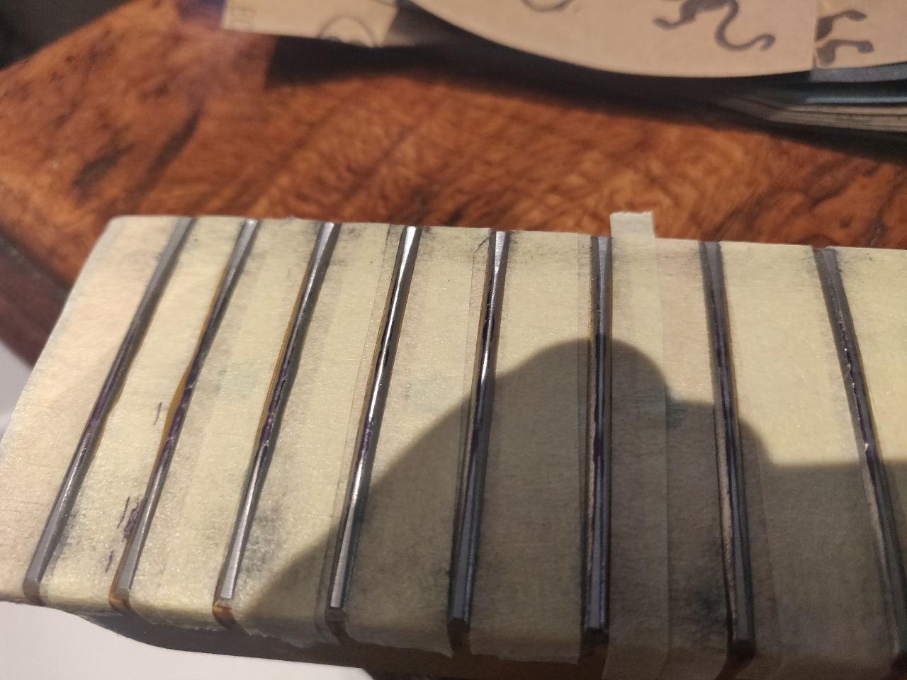 Will check that it all looks OK in daylight tomorrow, and then use the fret polishing rubbers I got from Crimson Guitars to finish up if so.