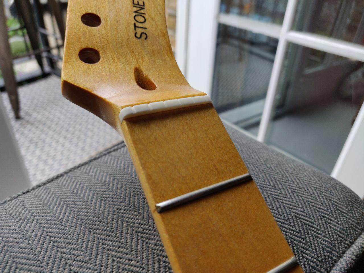 Over the last few weeks I've been putting on more and more coats of clear on the neck, and it finally reached the state I wanted it in. Although the Wudtone finish isn't meant to be used for a high gloss, the last few coats actually made it quite close to that, which wasn't quite what I wanted. Luckily, a bit of buffing with steel wool left it with a nice satin finish that actually feels smoother to the touch than it was when glossy. My hand slides along it in a way that feels pretty much right.