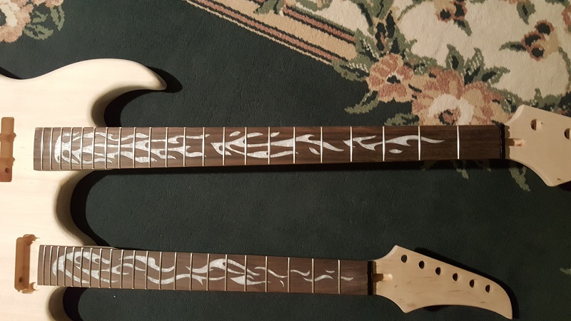 With the neck seating on your Behemoth from memory the Bass neck's bridge placement is not pre-determined however on the 6 stringer side of things it looks like the post holes come pre-drilled. This suggests caution is required to avoid compromising scale length and end up with intonation issues. Looks like there is some overhang past those 22 frets on each board which should help cover up things at the deep end of the neck pocket.