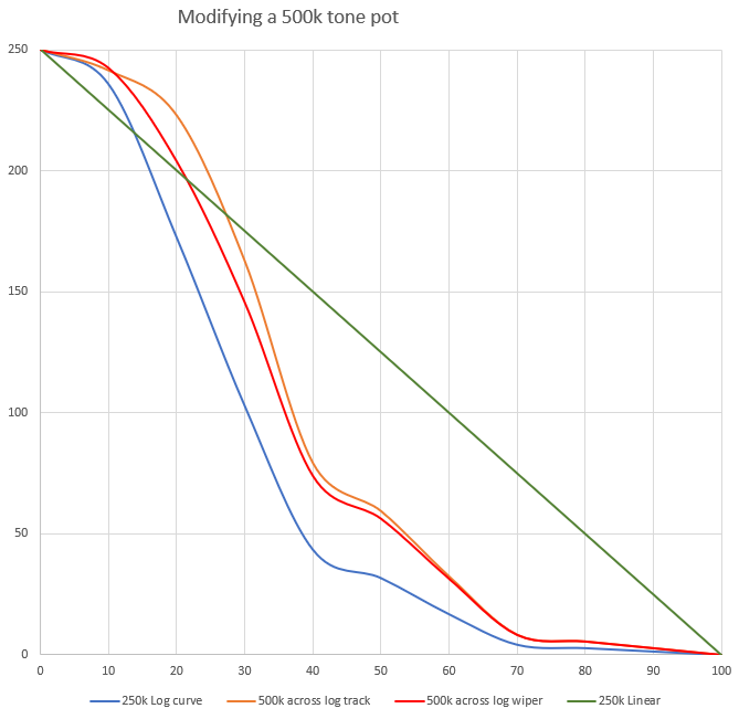 You can see the log curve (taken from measuring an Alpha 500k audio pot and scaled down to 250k to act as a comparison), and a theoretical linear taper (the start and finish points won’t be on 0 and 100). The two middle curves are the modified curves from putting a resistor in parallel with either the whole track or between the wiper and the connected end of the pot. Note that on the X axis, 0=tone fully up (set on 10) and 100 = tone knob fully down (set on 1 or 0 depending if you have Fender or Gibson knobs).