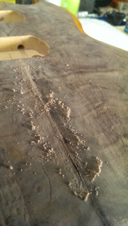 After all was dry i checked the surface, some small cracks had appeared and the middle join was slightly opened. I used superglue and some walnut dust to fill the middle join.
