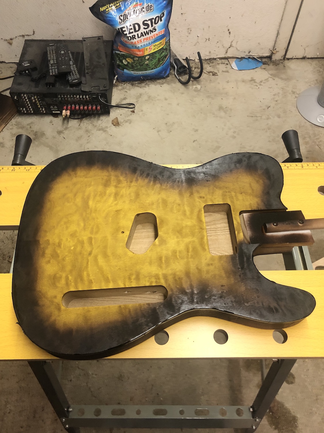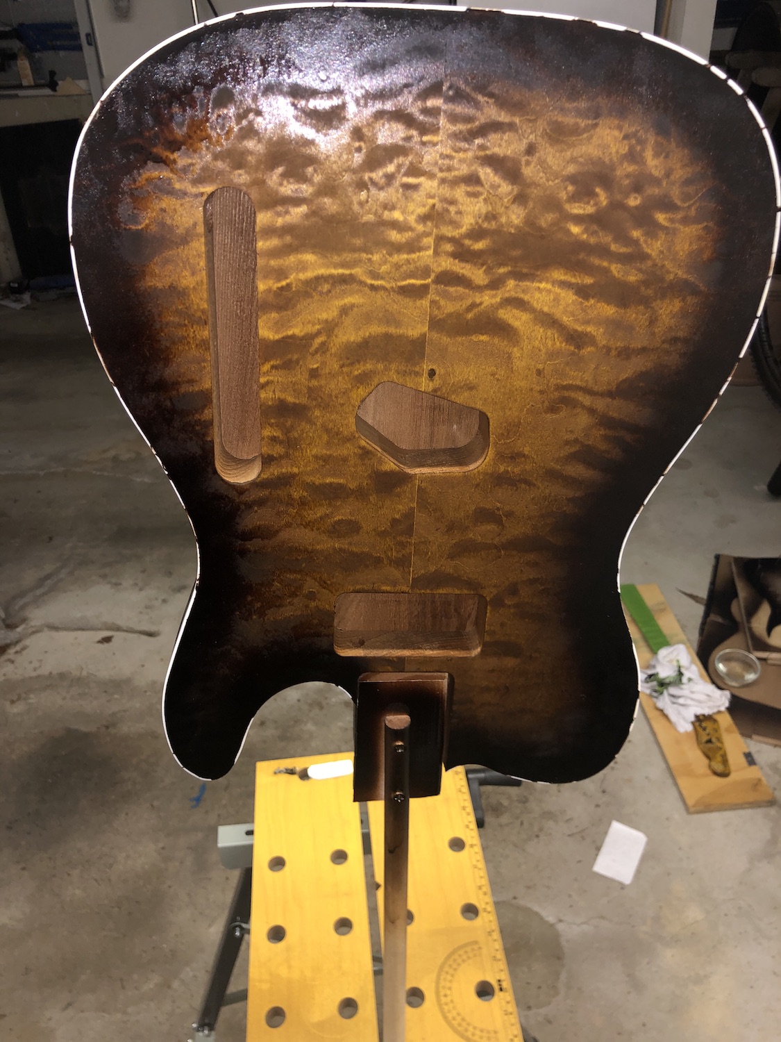 Here are pictures of the posterboard mask I made. I used screws to lift it 1/4in above the guitar body to allow for the burst. I sprayed down and slightly toward the middle of the guitar to get the overspray into the gap in the mask. It came out better than I expected. I used encore brown lacquer from Mohawk to get the look.