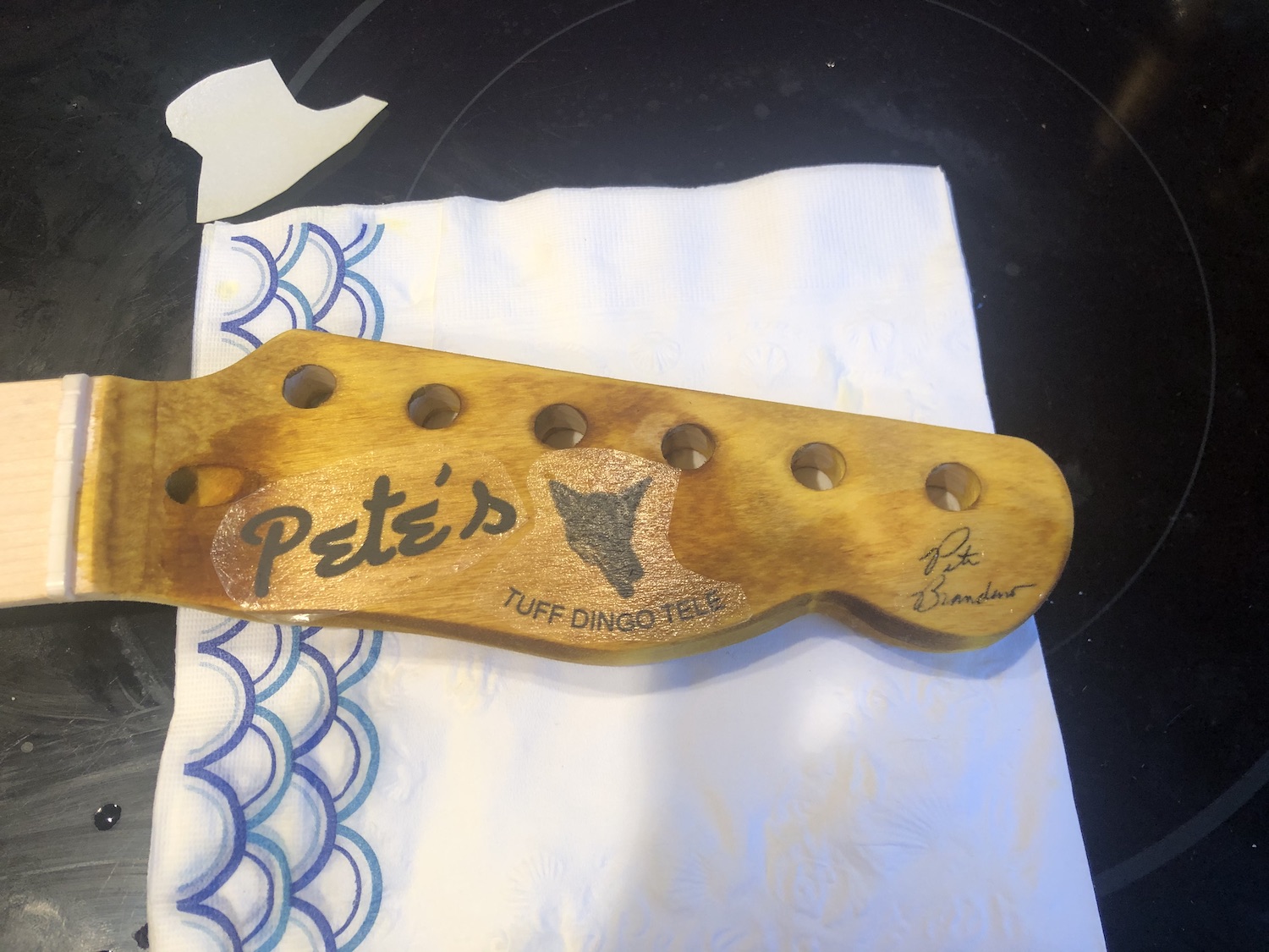 Here is the custom headstock decal I made. I am not psyched about the way they wrinkled when I sprayed the nitro.