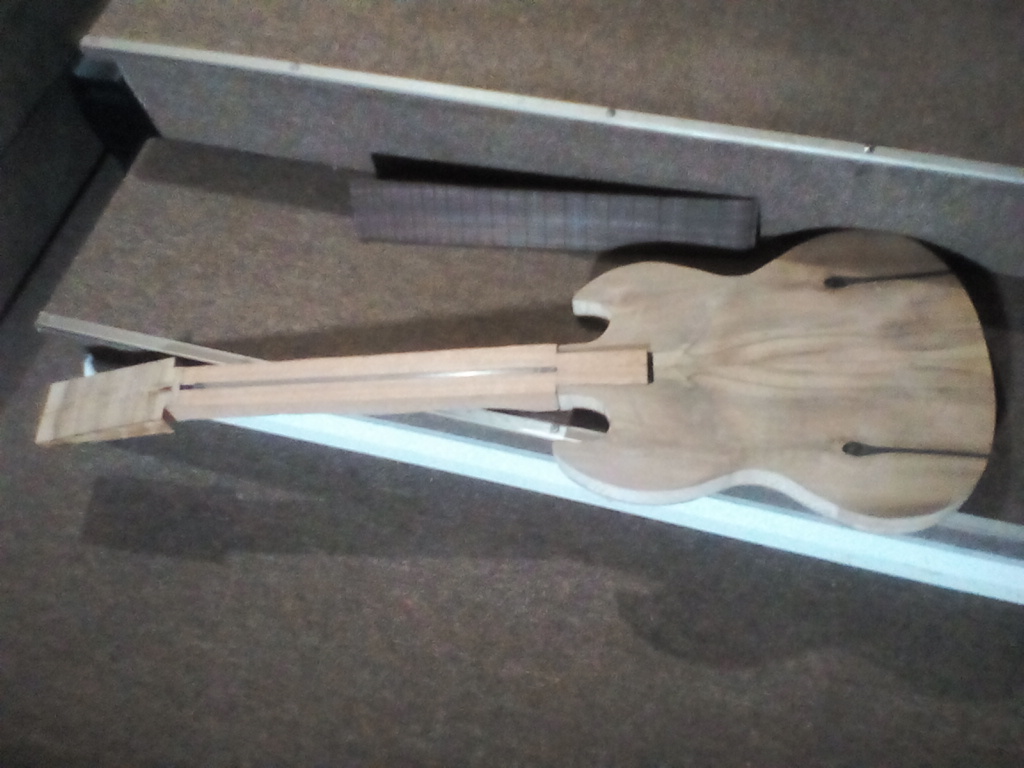 Well winter has hit and snow has slowed down progress, but I've made a bit of progress, body is shaped stained and sealed, neck has been final shaped and fretboard inlayed.